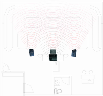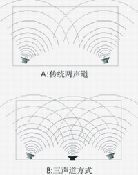 ,从声音效果上,能够使声音的密度感更好,声场更加宽阔,能够很好的营造出临场感和现场气氛。传统模式和三声道模式的声场比较示意如下左图(方框区域代表房间,曲线代表声波的传输):从下左图明显可以看到,采用三声道方式后,声场的均衡度大大增加,声音的也得到了增强。采用该工作方式后,不但歌唱时倍感轻松,现场感更好,更可灵活切换中间声道工作模式,使其适应独唱、合唱、清唱、电影、DISCO等不同工作模式。